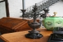 19e-eeuwse bronzen schouwklok met bijhorende kandelaars op marmeren voet.