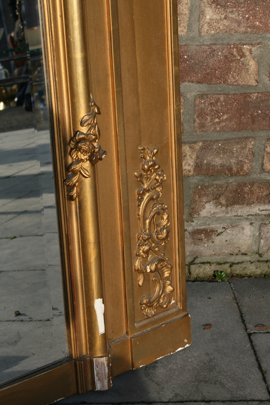 Eind 19e-eeuwse vergulde Louis 15 spiegel met geslepen glas voor op de schouw.