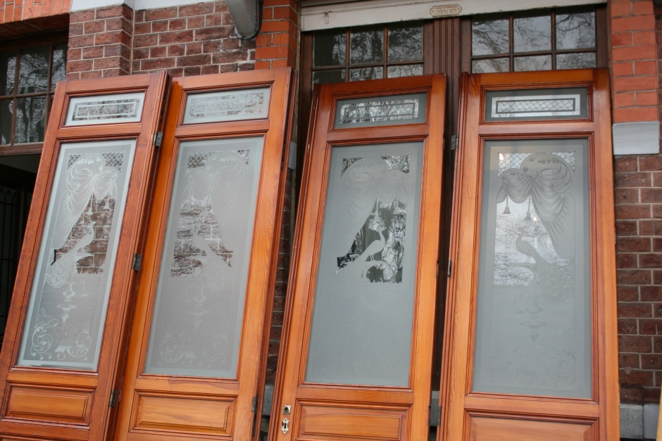 Art Nouveau 4-slag deur met geetst glas afkomstig uit een eind 19e-eeuws herenhuis in Brussel.